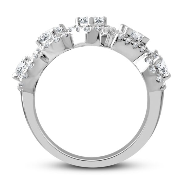 This striking diamond ring collection features five distinctively-shaped diamonds, symbolic of everything she means to you. Each diamond shape has a different meaning, from integrity and wisdom, to confidence, totality, and elegance. This gorgeous 10K white gold ring features a pear-shaped, round-cut, emerald-cut, princess-cut, and oval-cut diamond, each surrounded by a frame of sparkling round-cut diamonds. The ring has a total diamond weight of 1 3/4 carats.