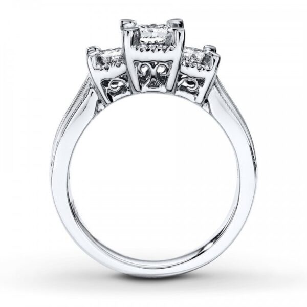 Representing your past, present and future together, this three-stone ring dazzles with a trio of princess-cut diamonds framed in round diamonds as its centerpiece. More round diamonds are channel-set along the band of 14K white gold to complement. The ring has a total diamond weight of 1 carat.